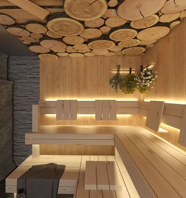 Serene sauna moments and cozy outdoor setups.
