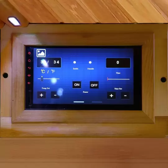 - DELUXE SAUNA KIT – Audio and temperature are adjusted from an LED touch screen with wireless connection. An included remote adjusts the ambient lighting with a touch of a button. Towel hooks and a magazine rack keep your sauna essentials within reach.