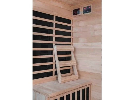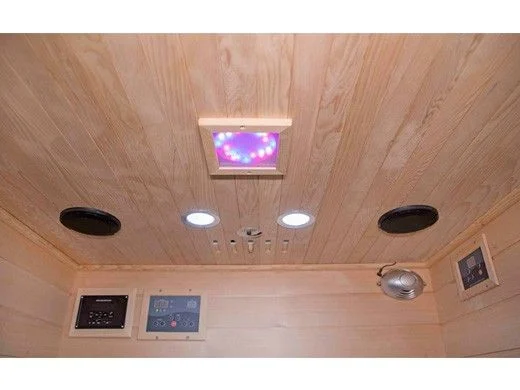 Sauna room seats up to four adults with nine carbon infrared heaters; operates up to 140 degrees F. Integrated sound system with wireless connectivity Full-length door and glass windows feature a frosted, stripe design. Electronic oxygen ionizer purifies the air Color therapy light enhances relaxation; interior and exterior lights add ambience Convenient, interior LED control panel Comes with one towel rack and one backrest.
