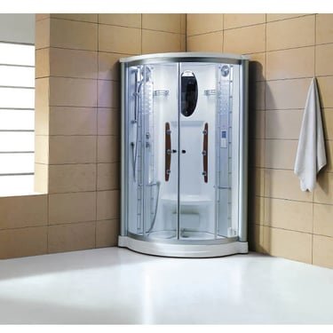 The Mesa WS-801A corner steam shower features sliding glass doors and a center-mounted bench seat.  A spacious corner model that has all the features of the larger units including a foot massager and 6 acupuncture massage jets, the WS-801A steam shower is a popular design for smaller bathrooms.