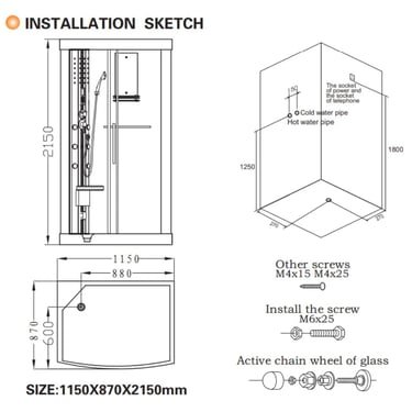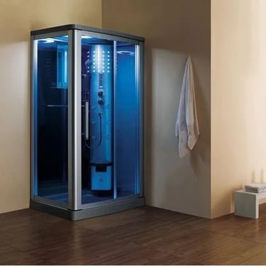 The Mesa WS-802L steam shower with right-side or left-side water controls has tempered blue glass with a sliding door. The WS-802L is a perfect steam shower for smaller bathrooms. It features polished nickel columns with a gray ceiling and base. This shower has a 3kW steam generator for ample steam output, a premium Bluetooth sound system, 6 soothing body massage jets, and an overhead rainfall ceiling. This shower also features a fold-up seat for additional space. The sleek design and slightly curved front add style and modern flare to any bathroom.